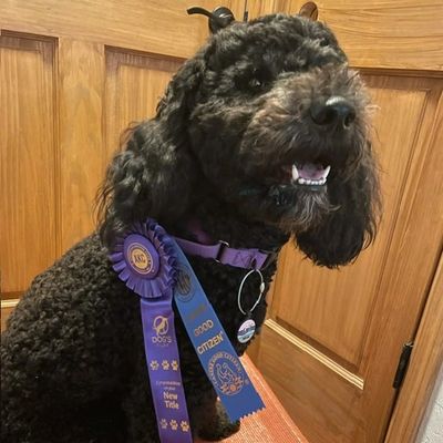 She is the first Barbet in the USA earning her novice and intermediate title in Kyra Sundance training, Do More With Your Dog. An Overachiever!
